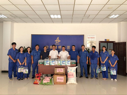 公司領(lǐng)導(dǎo)每到一處,都首先來到溫度最高,熱浪最強的一線施工現(xiàn)場,雖然烈日當(dāng)空,但是每到一處都會看到安徽路橋集團施工一線紅旗招展,機械轟鳴,一片大干繁忙的景象,領(lǐng)導(dǎo)們每到一處,最先關(guān)心的就是正在作業(yè)的一線施工人員,向他們表示親切的問候,并親手將綠豆、白糖、毛巾、洗發(fā)水、香皂等防暑降溫慰問品以及藿香正氣口服液風(fēng)、油精、十滴水等防暑降溫藥品送到一線職工手中,叮囑項目管理人員要合理安排員工作息時間,采取有效防暑降溫措施,保證高溫作業(yè)條件下員工的身體健康。