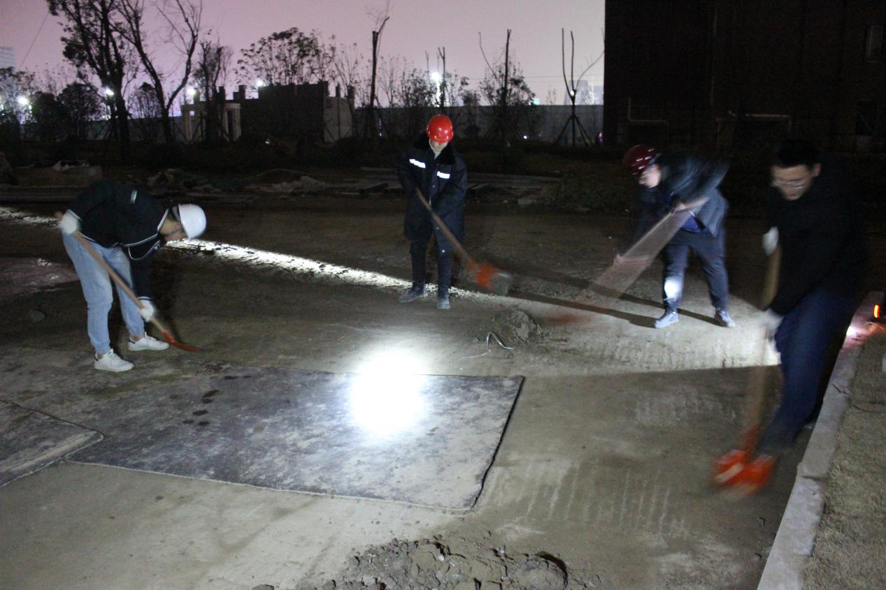 由于受到18年年末第一場(chǎng)雪的“洗禮”,積雪融化,導(dǎo)致項(xiàng)目內(nèi)的淤泥隨處可見,影響后期的施工進(jìn)度。為了實(shí)現(xiàn)白天夜晚交叉作業(yè),晚上六點(diǎn),阜陽公司黨支部書記、總經(jīng)理周鑫帶領(lǐng)全體黨員深入到泥土最多,工作難度較大的區(qū)域開展路面大清潔,并要求黨員亮明身份,積極發(fā)揮好先鋒模范作用。