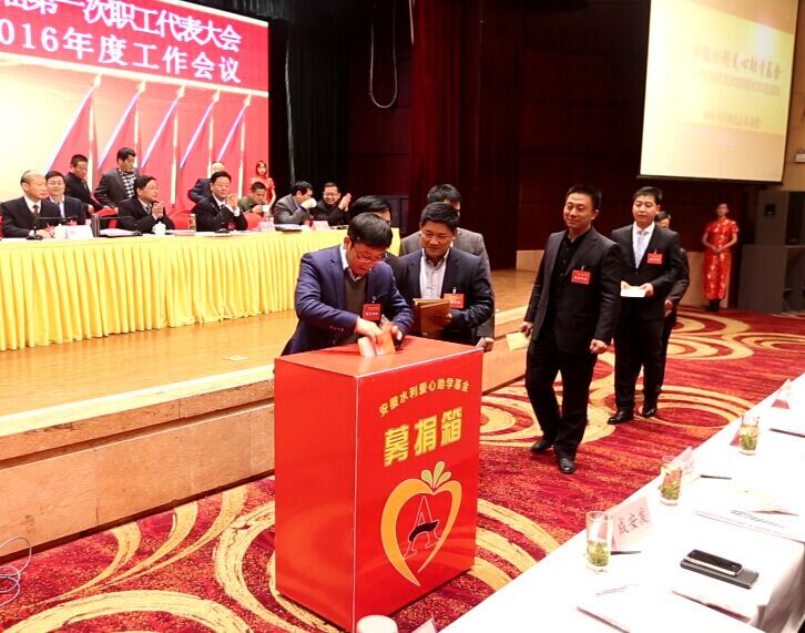 2016年3月4日上午,在安徽水利職代會上,舉行了“安徽水利愛心助學(xué)基金”第二次公開募捐儀式。捐款現(xiàn)場播放了基金宣傳片,溫馨而感人,安徽水利員工紛紛慷慨解囊,共募得善款近14萬元。
