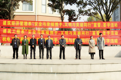 為保障學(xué)院學(xué)生身心健康,培養(yǎng)學(xué)生良好品行,有效預(yù)防青少年犯罪,對青少年的不良行為及時(shí)進(jìn)行預(yù)防和矯治,建筑經(jīng)濟(jì)管理系、建筑工程系、機(jī)電工程系與11月28日中午12:30分聯(lián)合組織學(xué)生開展了以“安全與幸福攜手,文明與美麗同行”為主題的宣誓、簽名活動(dòng)。副院長任建設(shè)、呂良玉、德育工作部蘇曉紅主任、團(tuán)委書記陳卓、三系主任、書記及全體學(xué)生管理人員參加了此次活動(dòng)。