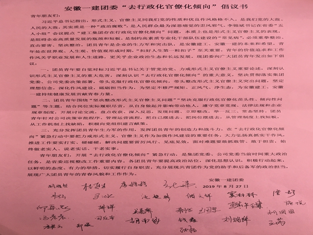 (四)在2019年的“去行政化官僚化傾向”的活動中,團(tuán)委組織青年倡議活動,團(tuán)員青年嚴(yán)格要求自己,不搞形式主義、官僚主義并堅決抵制,大力弘揚(yáng)真抓實(shí)干作風(fēng)。同時各團(tuán)支部組織青年團(tuán)員結(jié)合公司的實(shí)際、自己崗位職責(zé),對公司的制度文件、審批流程、決策程序、管理制度等方面進(jìn)行討論交流并提出相關(guān)的意見建議。
