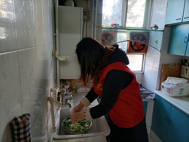 青年志愿者服務(wù)隊來到退休老職工家中,與職工們拉家常,了解他們的身體狀況和生活情況,并幫助他們打掃衛(wèi)生、清洗蔬菜。