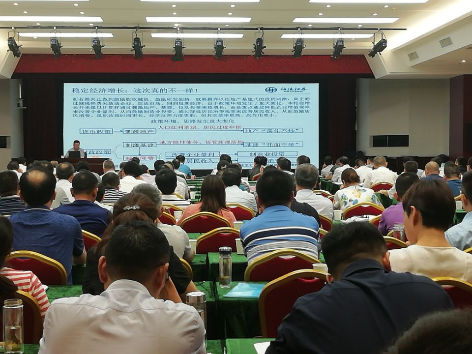 海通證券于博老師從我國(guó)國(guó)情出發(fā),緊密圍繞人口紅利消退、舉債發(fā)展經(jīng)濟(jì),債務(wù)周期見(jiàn)頂、去杠桿四步曲,貿(mào)易摩擦再現(xiàn)、短期迎來(lái)休戰(zhàn),轉(zhuǎn)型勢(shì)在必行、經(jīng)濟(jì)緩慢筑底,降利率提估值、從實(shí)物到金融等五個(gè)方面,宏觀分析了國(guó)內(nèi)經(jīng)濟(jì)發(fā)展情況,并對(duì)2019年下半年經(jīng)濟(jì)及資本市場(chǎng)進(jìn)行了展望。本次講座內(nèi)容豐富翔實(shí)、圖文并茂,與會(huì)人員聚精會(huì)神地聆聽(tīng),并認(rèn)真地做筆記。