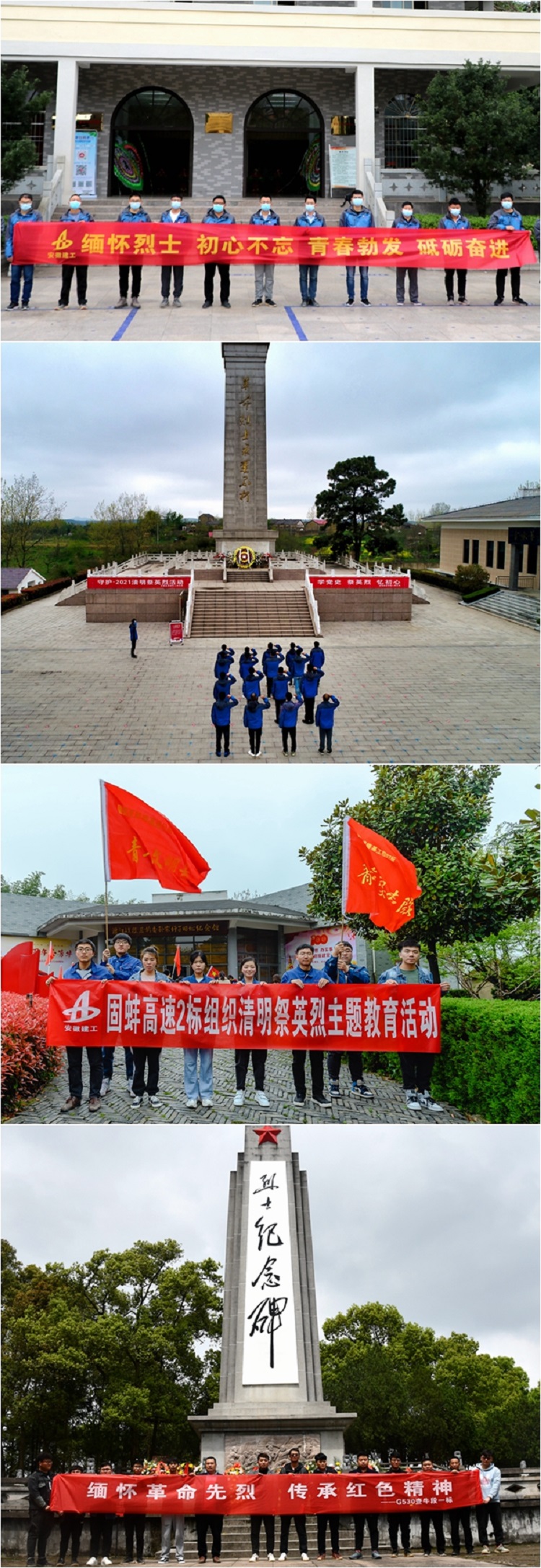 在紅色江西,公司承建的吉康改擴(kuò)建C1標(biāo)項(xiàng)目黨員及團(tuán)員青年前往遂川縣革命烈士紀(jì)念館,學(xué)習(xí)革命歷史,緬懷革命先烈,了解不同時(shí)期革命烈士的先進(jìn)事跡;滁河大橋項(xiàng)目黨支部在全椒周家崗革命烈士陵園開(kāi)展“緬懷革命先烈,傳承民族精神”為主題的清明祭掃活動(dòng),向烈士紀(jì)念碑敬獻(xiàn)花籃,寄托哀思。固蚌高速2標(biāo)項(xiàng)目部黨支部前往蚌埠渡江戰(zhàn)役總前委舊址紀(jì)念館參觀學(xué)習(xí),開(kāi)展以“學(xué)習(xí)黨史、不忘初心、牢記使命”為主題的教育活動(dòng); G530查橋至牛磯段一標(biāo)組織員工前往東至縣烈士陵園開(kāi)展“緬懷革命先烈、傳承紅色精神”清明祭掃活動(dòng);馬鞍山S247項(xiàng)目組織觀看《你記得我,我就活著》主題短片,學(xué)習(xí)黨史精講課程---《永不叛黨》,并積極開(kāi)展研討交流。