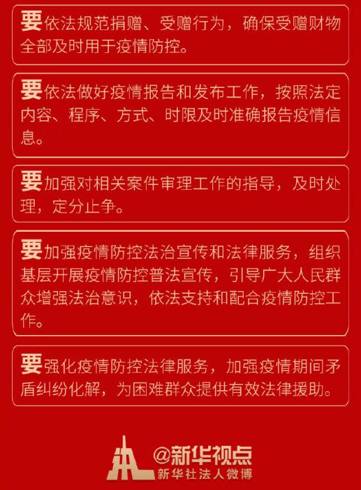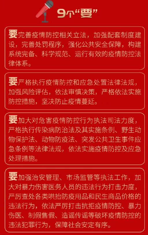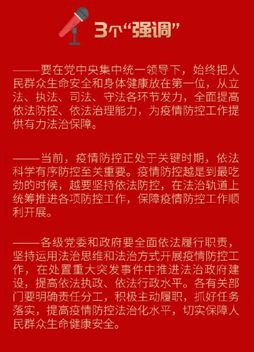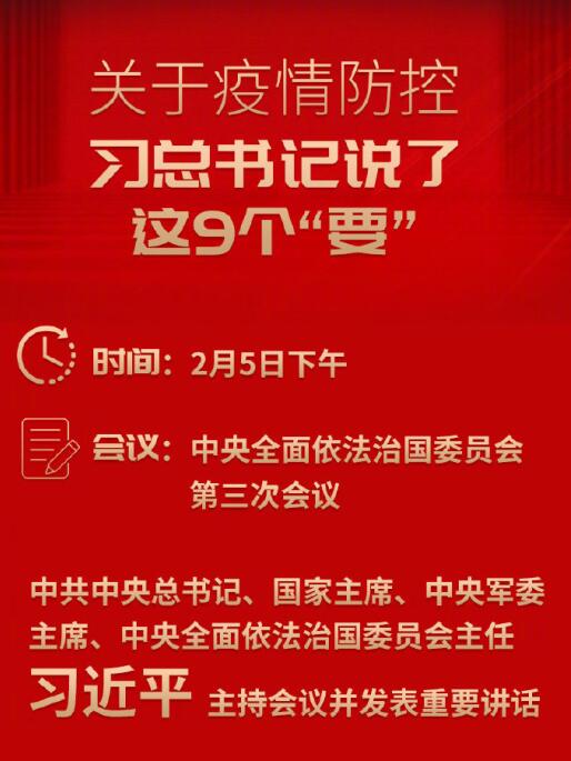 2月5日下午,中共中央總書記、國(guó)家主席、中央軍委主席、中央全面依法治國(guó)委員會(huì)主任習(xí)近平主持召開(kāi)中央全面依法治國(guó)委員會(huì)第三次會(huì)議強(qiáng)調(diào),全面提高依法防控依法治理能力,為疫情防控提供有力法治保障。