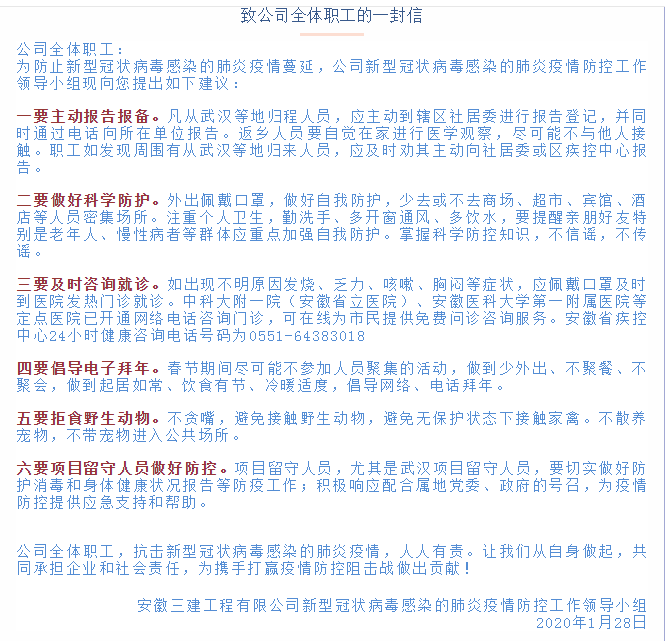 結(jié)合公司實際情況,通知對公司疫情防控工作做了具體安排,對和武漢相關(guān)的項目做了重點部署。要求一公司武漢項目及武漢項目歸來的人員,采取登記、居家隔離、每日定時健康報告等措施進(jìn)行防疫;對和武漢聯(lián)系較密切的軌道項目防疫也做了明確的要求。通知要求各單位對近期外出人員的梳理排查,做好職工的自我防控和自我隔離;落實近期前往武漢及外地人員的登記報告;嚴(yán)格做好在建項目部各項防護(hù)措施以及復(fù)工項目防控方案等報告制度,加強宣傳和信息通報。通知還就職工醫(yī)院、合肥市二院項目等單位配合有關(guān)部門做好疫情防控工作做了安排。