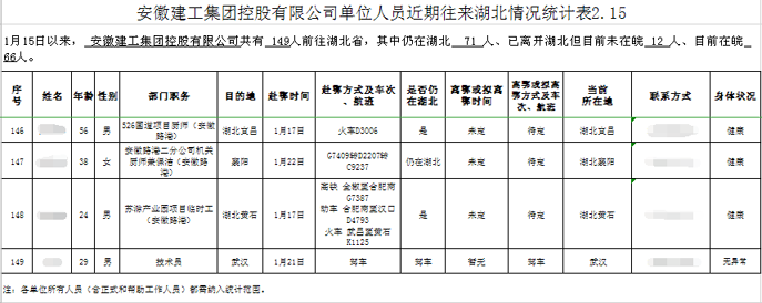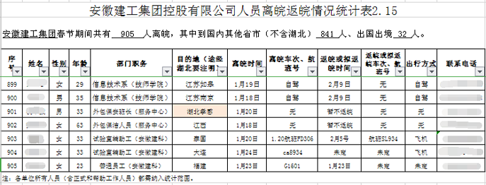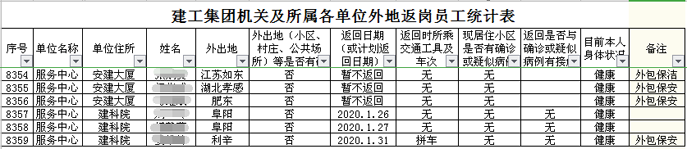 為了做好復(fù)工復(fù)產(chǎn)準(zhǔn)備,2月5日,人員防控組編制了《集團(tuán)機(jī)關(guān)及所屬各單位外地返崗員工統(tǒng)計(jì)表》,要求各單位全面統(tǒng)計(jì)離開工作所在地情況。鑒于建筑行業(yè)特殊性,集團(tuán)下屬機(jī)構(gòu)眾多,職工人數(shù)多,且分散在境外及全國各地,適逢春節(jié)往返,人員排查工作量較大,防控壓力較大。為做到摸排全覆蓋,一是要求各單位將在冊(cè)在崗員工、勞務(wù)派遣人員、項(xiàng)目外聘人員等全部納入統(tǒng)計(jì)范圍,每日更新報(bào)送。二是將合肥市區(qū)外的四縣一市納入統(tǒng)計(jì)范圍,確保全體返崗職工排查全覆蓋,各項(xiàng)防控措施落實(shí)全覆蓋。截至2月15日,集團(tuán)共有8359位員工離開工作地。