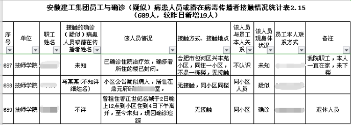 嚴(yán)格落實(shí)省委省政府、省國資委黨委要求,結(jié)合集團(tuán)人員分散實(shí)際,先后開展了出現(xiàn)相關(guān)癥狀人員情況排查,離皖返皖員工情況排查,近期往來湖北人員情況排查,與確診(疑似)病患或潛在病毒傳播者接觸情況排查,重點(diǎn)對(duì)出現(xiàn)相關(guān)癥狀、往返疫區(qū)、離皖返皖、外地返崗、有密切接觸可能的人員進(jìn)行實(shí)時(shí)關(guān)注和每日情況摸排,密切關(guān)注職工身體狀況。對(duì)符合自我隔離條件的各類人員作出明確規(guī)定,確保及時(shí)發(fā)現(xiàn)、及時(shí)報(bào)告和隔離,不留感染隱患。據(jù)統(tǒng)計(jì),春節(jié)期間集團(tuán)共有905人離皖,其中到國內(nèi)其他省市(不含湖北)841人、出國出境32人,全部逐一登記,有案可查。同時(shí),對(duì)1月15日以來前往湖北省的149人進(jìn)行詳細(xì)排查登記,其中仍在湖北71人、已離開湖北但目前未在皖 12 人、目前在皖 66人,全程掌握情況;對(duì)與確診(疑似)病患人員或潛在病毒傳播者接觸的689人全面排查,登記備案,積極配合屬地政府和所在社區(qū)加強(qiáng)疫情防控宣傳教育,做好自我隔離等各項(xiàng)防控工作,確保各項(xiàng)管控措施落實(shí)到位。