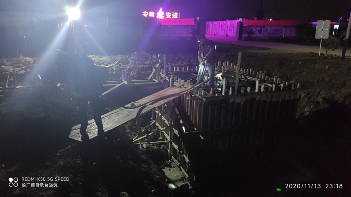 蚌埠市臨港智能制造產(chǎn)業(yè)園項(xiàng)目總建筑面積4.46萬(wàn)平方米,工程總造價(jià)8500萬(wàn)元,是蚌埠市“退市進(jìn)園”搬遷重點(diǎn)建設(shè)項(xiàng)目。初冬以至,天氣漸寒,項(xiàng)目上卻是一片大干的火熱景象,放線測(cè)量、鋼筋焊接、承臺(tái)澆筑……所有施工機(jī)械滿負(fù)荷運(yùn)轉(zhuǎn),所有項(xiàng)目人員均在生產(chǎn)一線爭(zhēng)分奪秒。按照原施工計(jì)劃,臨港項(xiàng)目189個(gè)承臺(tái)的鋼筋捆扎焊接及三千余立方的混凝土澆筑應(yīng)在11月底完成,但晴雨表顯示11月下旬均為陰雨天,所以必須提前完成此項(xiàng)施工任務(wù)。時(shí)間緊、任務(wù)重,項(xiàng)目部立刻行動(dòng)起來(lái),及時(shí)調(diào)整施工及進(jìn)度方案,加大人力、物力的投入,全體員工主動(dòng)放棄休息,不分晝夜、“5+2”“白+黑”,輪流堅(jiān)守在施工現(xiàn)場(chǎng)。臨港的夜幕已經(jīng)緩緩降臨,但項(xiàng)目上仍然人頭攢動(dòng)、身影忙碌,施工人員在黑夜的畫紙上勾勒出了一副“大干快上,只爭(zhēng)朝夕”的場(chǎng)景。