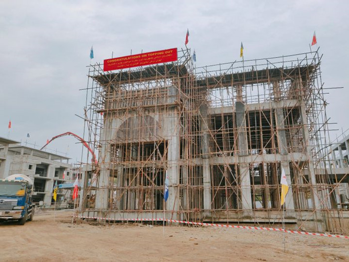 阿富汗駐巴使館項目,位于伊斯蘭堡周恩來大道北側(cè),總建筑面積18834.44平方米,于2018年9月開工,項目部全體員工克服現(xiàn)場無市政用電、施工圖紙不全、高溫炎熱天氣與雨季施工等困難,特別是2020年遭遇新冠疫情,巴基斯坦分公司積極協(xié)調(diào)努力,聯(lián)系包機分批接回滯留國內(nèi)人員,網(wǎng)格化管理屬地用工,在嚴(yán)密落實疫情防控措施的前提下迅速推進工程進度,終于完成封頂任務(wù)。