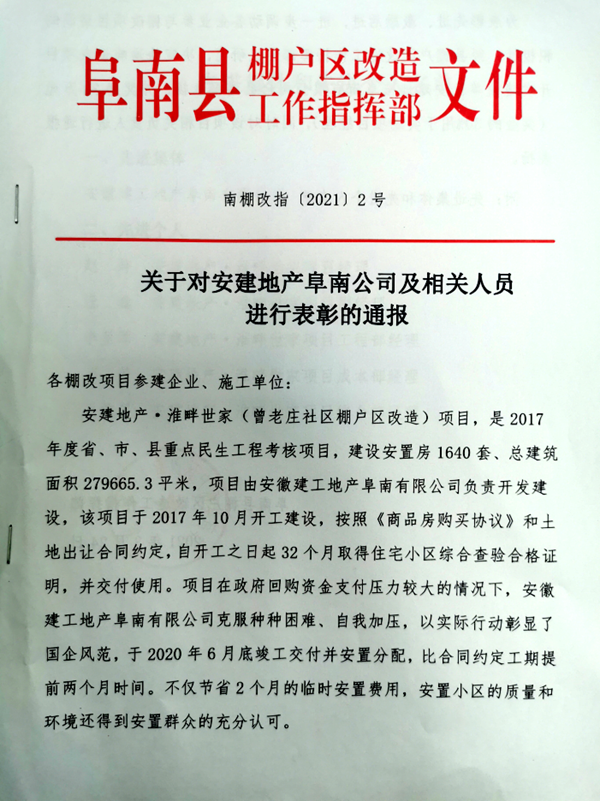 4月6日,由安建地產(chǎn)開發(fā)建設(shè)的淮畔世家項目獲得阜南縣棚戶區(qū)改造工作指揮部全縣通報表彰,并獲得獎勵30萬元。