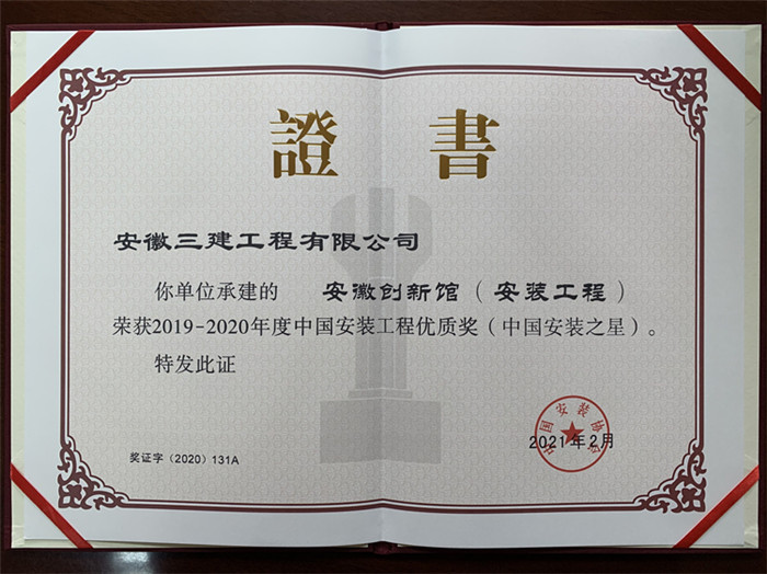 4月22日,中國安裝協(xié)會(huì)第七屆二次理事(擴(kuò)大)會(huì)議暨工程創(chuàng)優(yōu)經(jīng)驗(yàn)交流會(huì)在濟(jì)南召開。會(huì)議對(duì)2019-2020年度中國安裝工程優(yōu)質(zhì)獎(jiǎng)(中國安裝之星)獲獎(jiǎng)單位進(jìn)行表彰并頒發(fā)獎(jiǎng)杯和榮譽(yù)證書;安徽三建合肥市二院新區(qū)內(nèi)科病房大樓項(xiàng)目及安徽創(chuàng)新館項(xiàng)目(安裝工程)獲此殊榮。該獎(jiǎng)項(xiàng)獲得充分說明了安徽三建安裝施工水平。