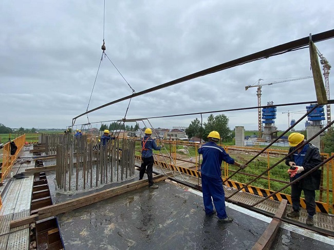 在開(kāi)工前,項(xiàng)目部精心組織,合理安排。相關(guān)技術(shù)人員進(jìn)行了支撐平臺(tái)的的專項(xiàng)驗(yàn)收,科學(xué)布控施工組織,在原材、配合比、運(yùn)輸、布料方法、澆筑速度等環(huán)節(jié)嚴(yán)格把控,安排專人全程監(jiān)測(cè)支撐平臺(tái)。由于受場(chǎng)地地基基礎(chǔ)限制,施工難度較大,項(xiàng)目部技術(shù)人員克服困難、潛心鉆研,反復(fù)驗(yàn)算推演,采用穿心棒法進(jìn)行施工。在澆筑過(guò)程中,工人協(xié)作緊密,有條不紊地進(jìn)行蓋梁澆筑作業(yè),技術(shù)人員密切關(guān)注澆筑過(guò)程中的每個(gè)細(xì)節(jié),認(rèn)真指導(dǎo),及時(shí)優(yōu)化調(diào)整施工中出現(xiàn)的問(wèn)題。
