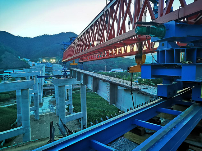 伊河大橋為左右分離式大橋,跨地方水泥路、國道311和伊河,沿線有不少村莊住戶,對施工安全環(huán)保方面有更高要求。為此項目部專門增設(shè)灑水車、霧炮以及噴淋系統(tǒng),并用硬質(zhì)擋板與居民生活區(qū)分開。伴隨著機械的轟鳴聲,牽引車將T梁緩緩運至施工點位,經(jīng)過施工人員半個小時的努力,提梁、位移、落梁等工序一氣呵成,T梁一次安裝就位,在場人員共同見證了這激動人心的時刻。