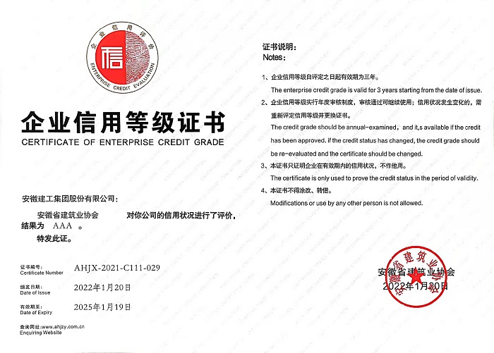 安徽建工集團(tuán)作為省屬大型國(guó)有上市企業(yè),秉承“創(chuàng)造空間藝術(shù),成就人文生活”的企業(yè)使命,堅(jiān)守“誠(chéng)信為本、敬業(yè)至上”的企業(yè)核心價(jià)值觀,恪守“重合同、守信譽(yù)”和“質(zhì)量第一、用戶(hù)至上”服務(wù)宗旨,強(qiáng)化信用體系建設(shè),加強(qiáng)項(xiàng)目履約管理,樹(shù)立良好品牌形象。此次獲評(píng)AAA級(jí)信用企業(yè),是繼中國(guó)建筑業(yè)協(xié)會(huì)“建筑業(yè)AAA級(jí)信用企業(yè)” “中企聯(lián)2020年第一批AAA級(jí)信用企業(yè)”“中國(guó)承包商80強(qiáng)”“納稅信用A級(jí)納稅人”后的誠(chéng)信體系建設(shè)又一新成果。
