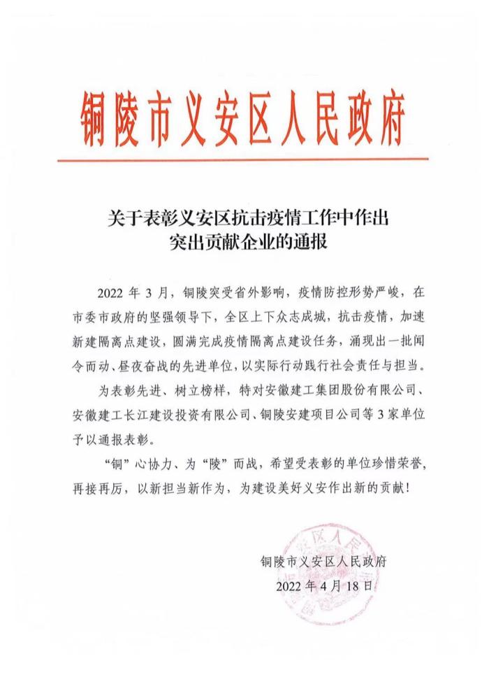 近日,安徽建工和長江建投獲銅陵市義安區(qū)人民政府通報表彰。通報指出,安徽建工和長江建投等先進單位積極響應(yīng)銅陵市委市政府號召,聞令而動晝夜奮戰(zhàn),圓滿完成疫情應(yīng)急隔離點建設(shè)任務(wù),以實際行動踐行省屬國企的社會責(zé)任與擔(dān)當(dāng)。