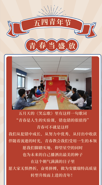 在五四青年節(jié)來臨之際,安徽瑞特團支部組織觀看《電影黨課:五四精神》微視頻,點燃青年職工愛國熱情;通過召開五四青年職工在專題座談會面對面交流分享建團百年心得感悟、重溫入團誓詞、與團旗合影,進一步筑牢愛國、愛企情懷;在五四青年節(jié)當天,團支部發(fā)出五四青春寄語,引導(dǎo)青年職工將五四精神融入青年奮斗,譜寫新時代華章,為公司高質(zhì)量轉(zhuǎn)型升級貢獻青年力量。