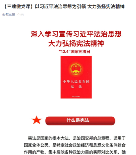 集團(tuán)團(tuán)委積極動(dòng)員共青團(tuán)員參加“憲法宣傳周”活動(dòng)。12月4日,安徽建機(jī)團(tuán)委開(kāi)展憲法知識(shí)講座主題團(tuán)日活動(dòng),邀請(qǐng)了法務(wù)人員從憲法是什么、新中國(guó)憲法的發(fā)展歷程、我國(guó)現(xiàn)行憲法結(jié)構(gòu)、2018年我國(guó)憲法具體修改的內(nèi)容進(jìn)行深入淺出的講解。