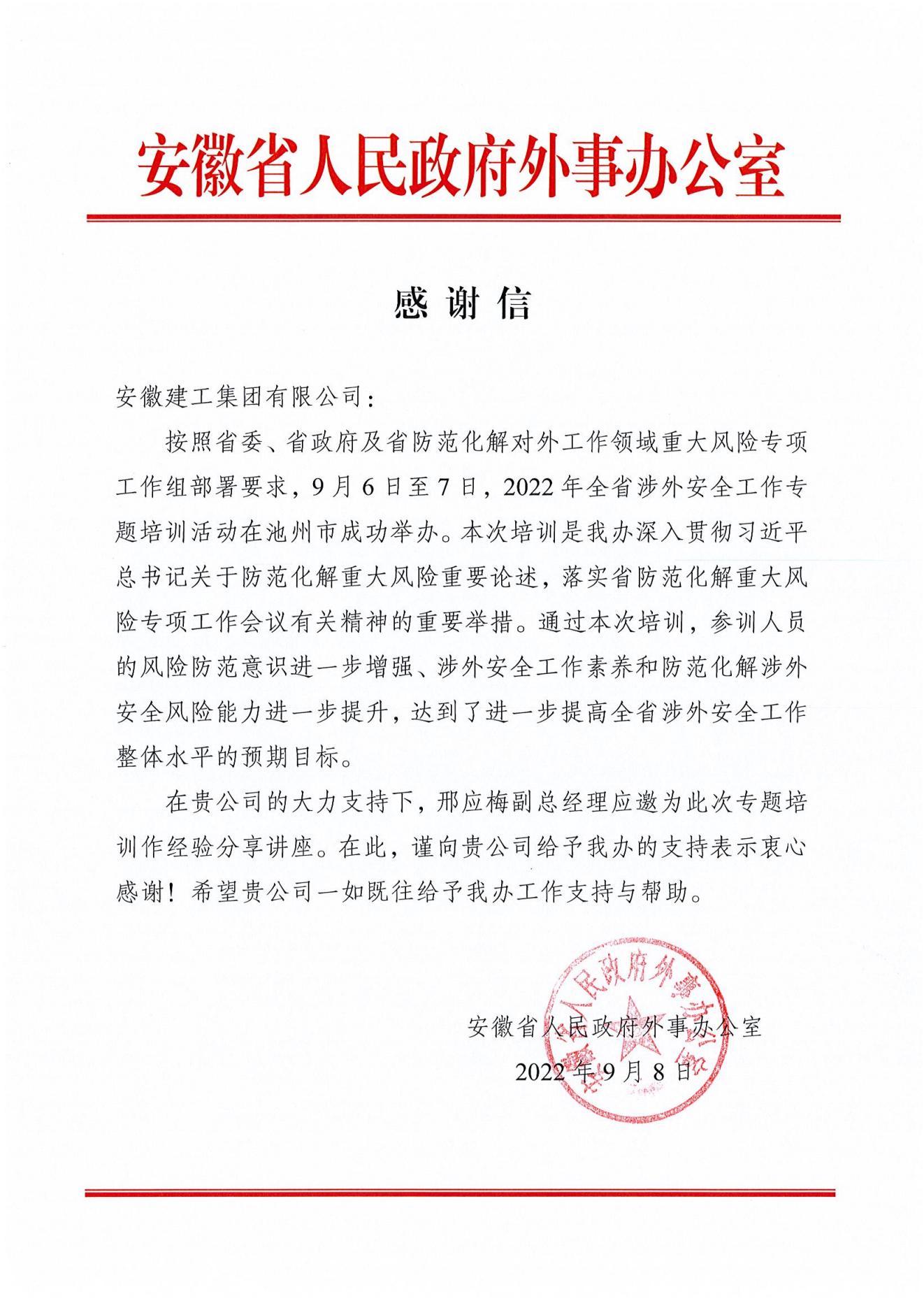 近日,安徽省人民政府外事辦公室向安徽建工集團(tuán)發(fā)來(lái)感謝信,對(duì)集團(tuán)在全省涉外安全工作專(zhuān)題培訓(xùn)活動(dòng)中給予的支持表示感謝。