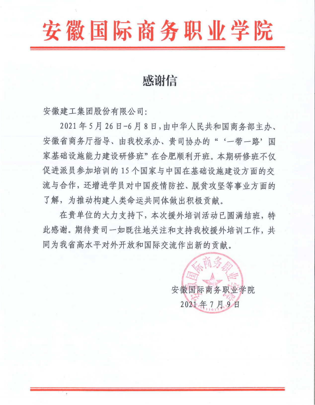 7月9日,安徽集團股份有限公司海外事業(yè)部收到安徽國際商務職業(yè)學院來信,對集團在2021年度“一帶一路”國家基礎設施能力建設研修班舉辦過程中給予的大力支持表示感謝。