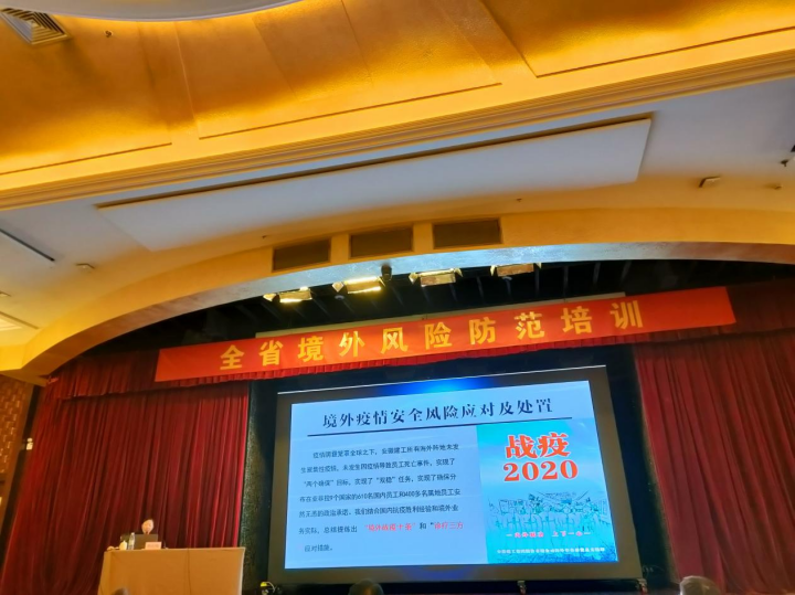 7月15日下午,安徽建工集團(tuán)股份公司副總經(jīng)理,海外事業(yè)部黨總支書記、總經(jīng)理邢應(yīng)梅應(yīng)邀參加全省境外風(fēng)險(xiǎn)防范培訓(xùn)班并作《企業(yè)境外安全風(fēng)險(xiǎn)防范》專題授課。該培訓(xùn)由安徽省商務(wù)廳主辦,安徽省各地市商務(wù)主管部門負(fù)責(zé)人和省內(nèi)外經(jīng)外貿(mào)企業(yè)負(fù)責(zé)人近200人參加培訓(xùn)。