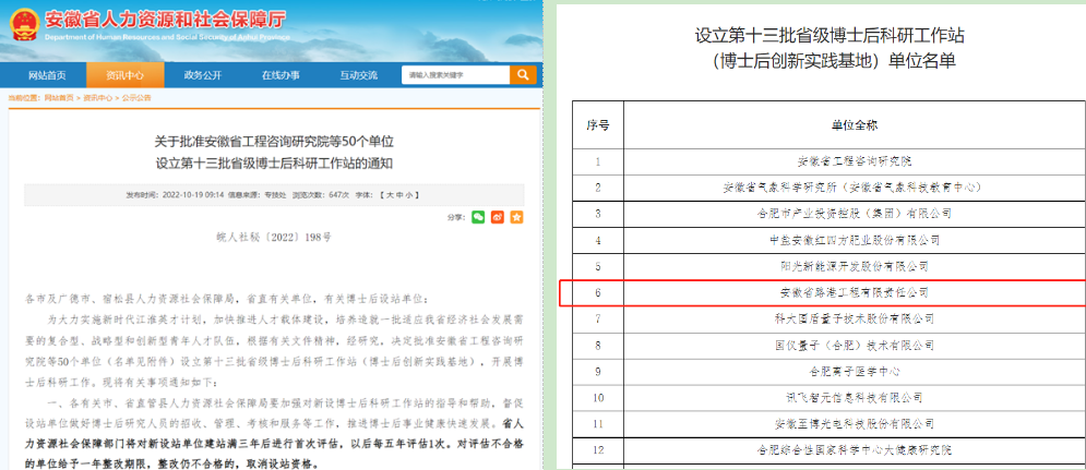 近日,安徽省人力和資源保障廳發(fā)布了《第十三批省級博士后科研工作站(博士后創(chuàng)新實(shí)踐基地)名單》(皖人社秘〔2022〕198號),集團(tuán)所屬安徽省路港工程有限責(zé)任公司成功獲批省級博士后科研工作站,自此集團(tuán)公司博士后工作站規(guī)模達(dá)3個(gè),標(biāo)志著集團(tuán)公司在高水平科學(xué)研究、高層次人才培養(yǎng)方面又取得了重大突破。