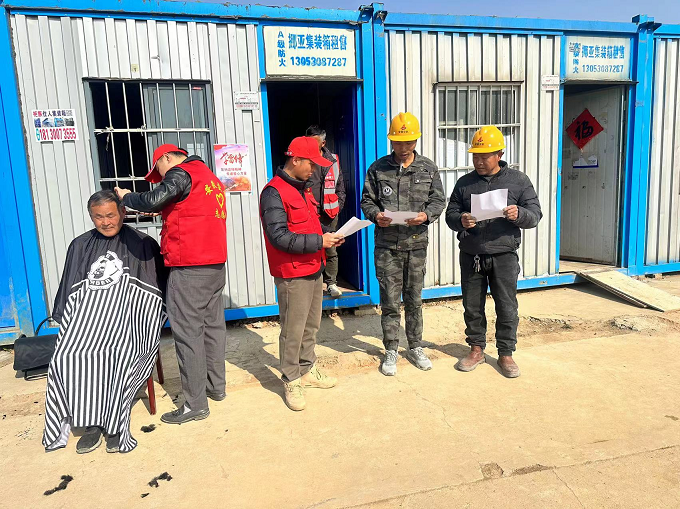 潭沖河家園項(xiàng)目發(fā)動(dòng)青年志愿者們?yōu)轫?xiàng)目工人發(fā)放文明宣傳手冊(cè),講解宣傳合肥市民公約(守則),同時(shí)團(tuán)支部組織志愿者服務(wù)活動(dòng),為工人提供義務(wù)理發(fā)。