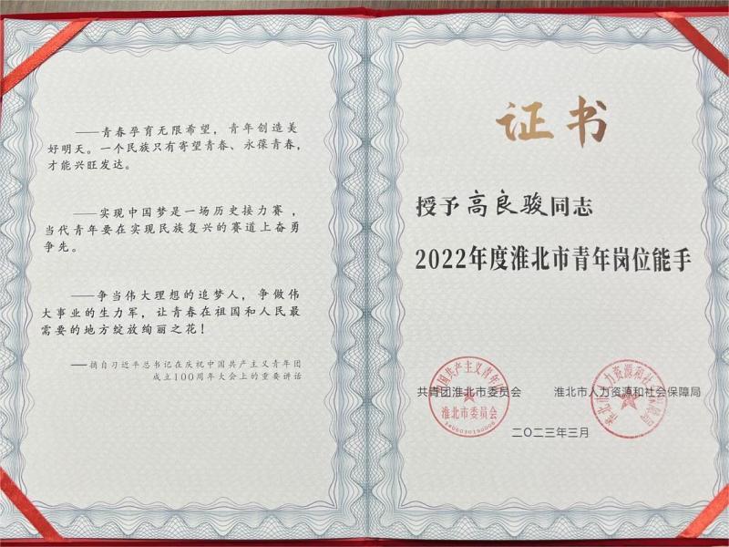 為深入學習貫徹習近平新時代中國特色社會主義思想,認真貫徹落實習近平總書記對技能人才工作的系列重要指示精神,淮北市團市委聯(lián)合淮北市人力資源和社會保障局開展了2022年度“淮北市青年崗位能手”命名活動,建材科技三分公司高良駿被授予“淮北市青年崗位能手”榮譽稱號。