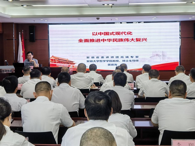 培訓(xùn)邀請到安徽省委宣講團高端專家,安徽大學(xué)哲學(xué)學(xué)院教授、博士生導(dǎo)師裴德海進行授課。裴教授通過《以中國式現(xiàn)代化全面推進中華民族偉大復(fù)興》這一主題,系統(tǒng)闡釋了什么是“中國式現(xiàn)代化”、“中國式現(xiàn)代化”的本質(zhì)要求、“中國式現(xiàn)代化”理論背景和依據(jù)、“中國式現(xiàn)代化”總體戰(zhàn)略安排、實現(xiàn)“中國式現(xiàn)代化”必須牢牢把握的準則等內(nèi)容,梳理了中國式現(xiàn)代化的發(fā)展脈絡(luò),幫助大家理解和學(xué)習(xí)了中國式現(xiàn)代化的深刻內(nèi)涵及重大意義。廣大學(xué)員紛紛表示,作為黨員領(lǐng)導(dǎo)干部,要在黨的領(lǐng)導(dǎo)下,始終保持“闖”的精神、“創(chuàng)”的勁頭、“干”的作風(fēng),堅定信念,踏實工作,自覺肩負起建設(shè)中國特色社會主義現(xiàn)代化強國的歷史使命,為開創(chuàng)公司高質(zhì)量發(fā)展新局面凝聚磅礴力量。