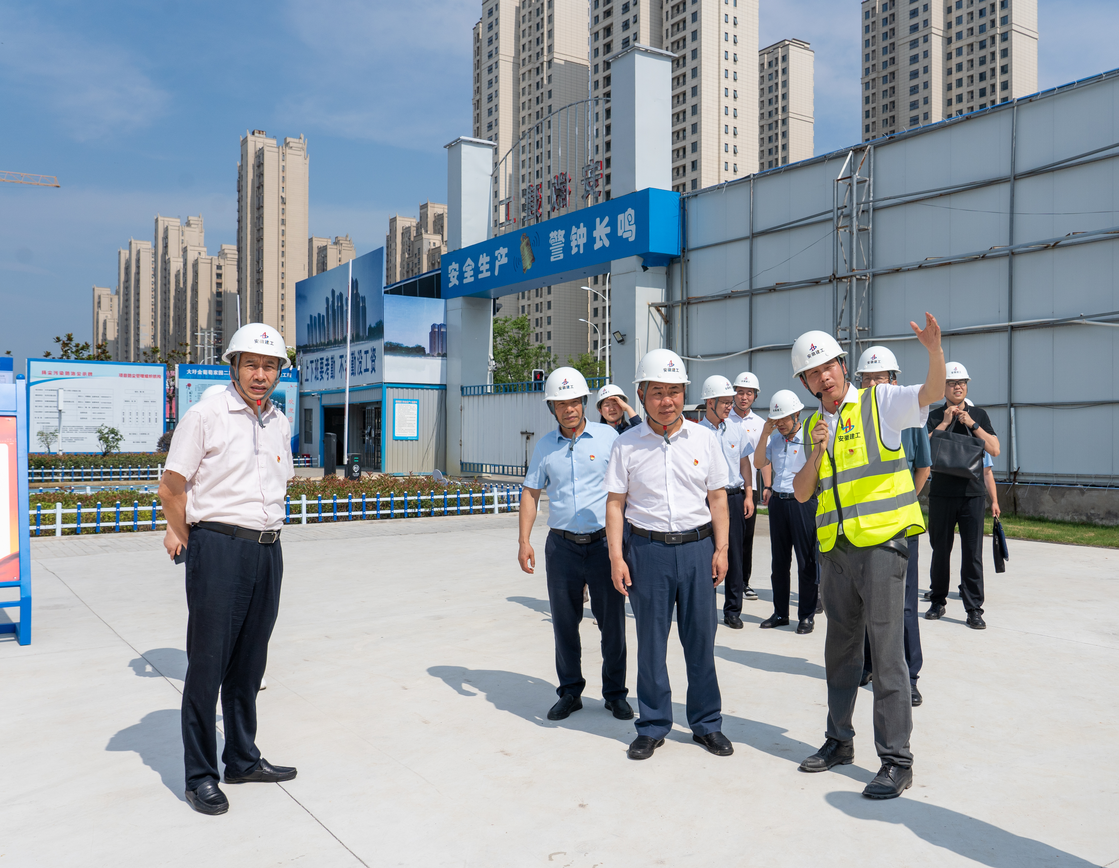 段海一行先后深入項(xiàng)目現(xiàn)場和黨員活動(dòng)室,對(duì)項(xiàng)目樣板展牌、智慧展廳、鋁模爬架、裝配式等新技術(shù)、新工藝以及基層黨建活動(dòng)開展情況進(jìn)行觀摩和了解,對(duì)項(xiàng)目生產(chǎn)經(jīng)營工作和“彩虹扣”黨建品牌、黨員1+N監(jiān)督崗等特色活動(dòng)的開展表示肯定。