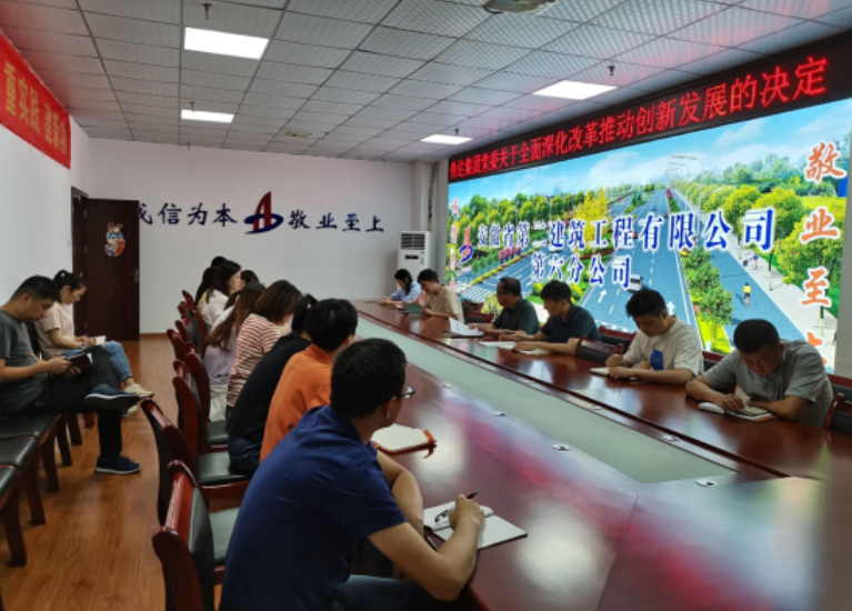 第六公司黨支部傳達學(xué)習(xí)安徽建工集團全面深化改革推動創(chuàng)新發(fā)展動員部署暨主題教育黨課報告會精神。會議要求,一要提高政治站位,統(tǒng)一思想認(rèn)識,充分認(rèn)識到集團深化改革推動創(chuàng)新發(fā)展是一項意義重大、影響深遠的綜合性改革,是集團在新起點上,把握新形勢新要求,謀劃新思路新發(fā)展的舉措,要全面貫徹落實建工控股黨委的決策部署,認(rèn)真把握集團全面深化改革推動創(chuàng)新發(fā)展的歷史使命;二要緊緊圍繞集團戰(zhàn)略部署和工作安排,進一步樹立為集團大發(fā)展、轉(zhuǎn)型發(fā)展、高質(zhì)量發(fā)展作貢獻的責(zé)任和擔(dān)當(dāng)意識;三要認(rèn)真落實集團工作安排,進一步做好市場開拓,搶抓市場先機,持續(xù)推進項目標(biāo)準(zhǔn)化建設(shè),嚴(yán)格落實集團、公司各項規(guī)定,樹牢風(fēng)險意識,做到“五個嚴(yán)”,持續(xù)推動公司改革轉(zhuǎn)型、高質(zhì)量發(fā)展。