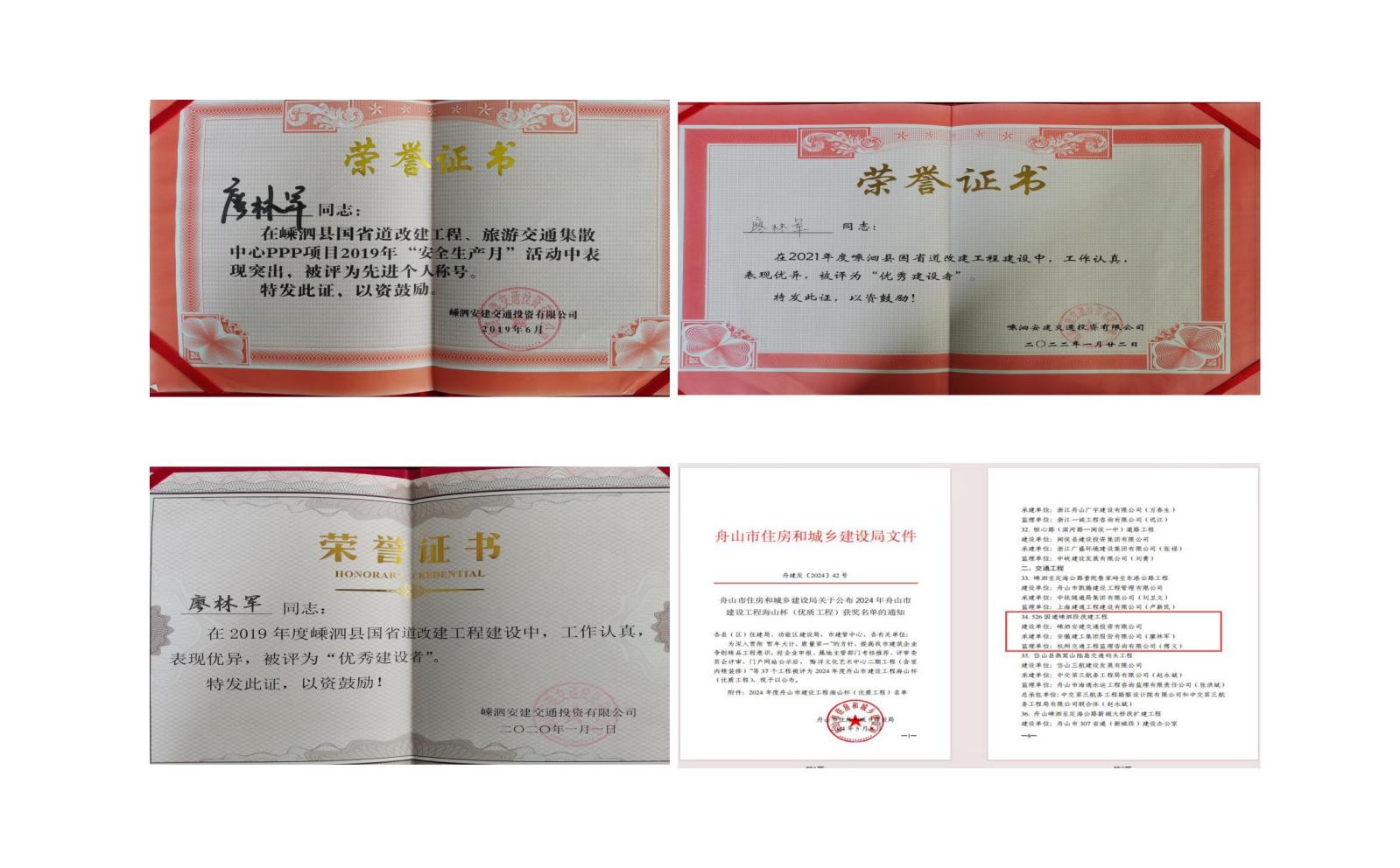 526國道嵊泗項(xiàng)目獲得了 2024 年舟山市建設(shè)工程海山杯(優(yōu)質(zhì)工程)獎(jiǎng),廖林軍也積累了豐富的施工管理經(jīng)驗(yàn),多次被項(xiàng)目公司評為“優(yōu)秀建設(shè)者”。