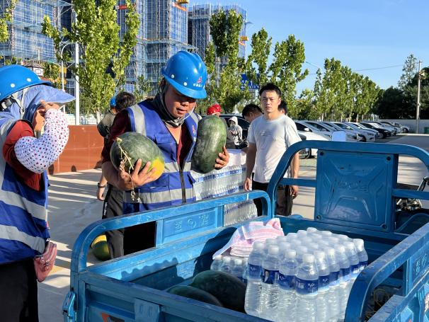 活動現(xiàn)場,項目部為現(xiàn)場一線工人代表送上了礦泉水、西瓜、藥品等防暑降溫物品,向他們表示親切問候,感謝他們一直以來的辛苦付出,叮囑他們在高溫天氣下要注意勞逸結(jié)合、做好防護,確保自身健康和安全。