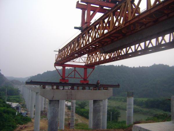 該橋左幅17跨,右幅16跨,為25 m先簡支后連續(xù)預(yù)應(yīng)力砼小箱梁,全橋共有箱梁132片,最大安裝重量75t。采用1套QD100T/30m架橋機(jī),依次進(jìn)行K10+236.75大橋左右幅箱梁安裝,箱梁采用運(yùn)梁炮車運(yùn)輸。橋體處于本標(biāo)段標(biāo)尾與02標(biāo)接頭,橫跨大源河,交通不便,各種物資到達(dá)及站內(nèi)調(diào)車作業(yè)極為困難。為確保安全、優(yōu)質(zhì)地完成這次鋪架任務(wù),項目部精心組織,做好準(zhǔn)備工作,協(xié)調(diào)好各項事宜,制定了詳細(xì)、切實(shí)可行的架梁方案。