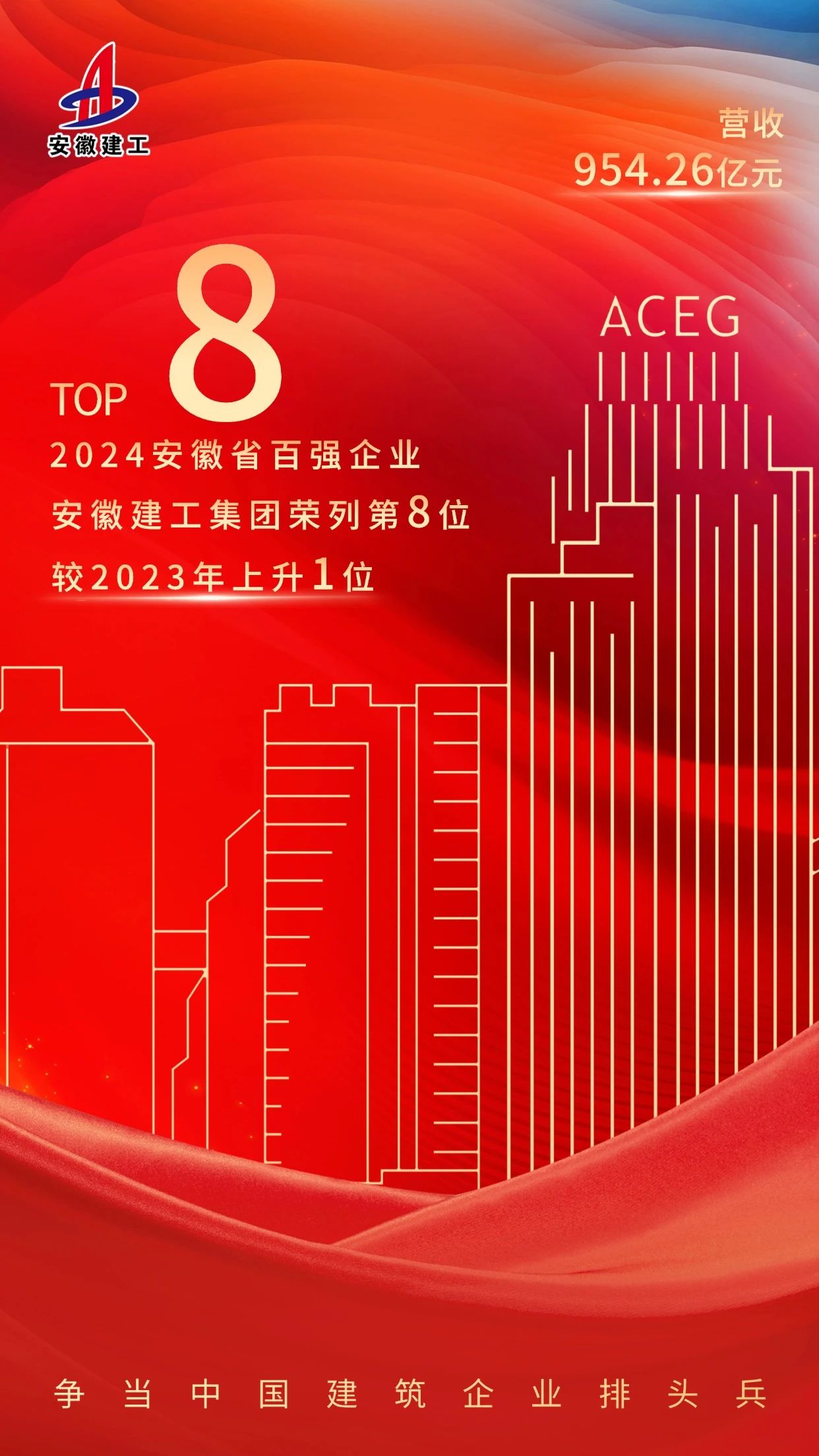 11月23日,安徽省企業(yè)聯(lián)合會、企業(yè)家聯(lián)合會發(fā)布“2024安徽省百強企業(yè)榜單”,安徽建工集團控股有限公司以營業(yè)收入954.26億元的成績榮列“2024安徽省百強企業(yè)”榜單第8位,較2023年上升一位。