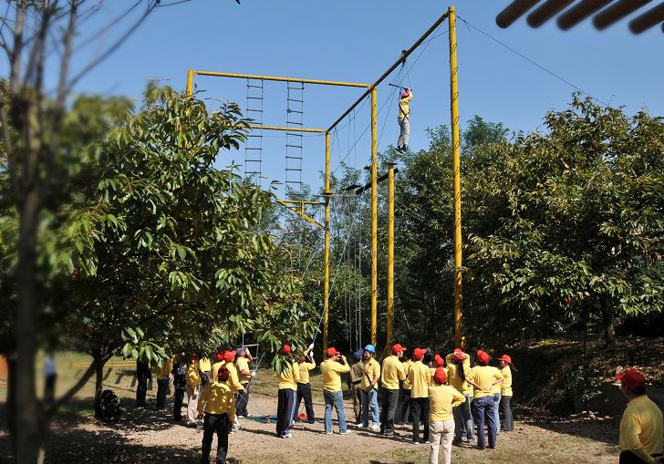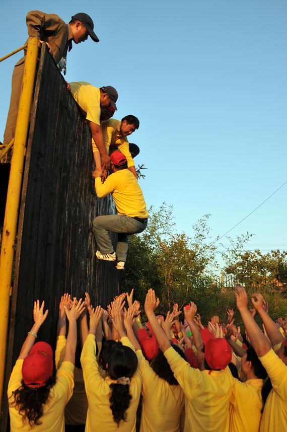 培訓(xùn)公司精心設(shè)計了“破冰”、“盲人方陣”、“車輪滾滾”、“高空抓杠”及“生命墻”等有趣、刺激而又極具挑戰(zhàn)性的活動。培訓(xùn)活動在輕松幽默的“破冰”游戲中開始,使大家充分體驗了團結(jié)協(xié)作、平等友愛的快樂。接著培訓(xùn)教練將參訓(xùn)人員隨機分為六個團隊,大家推選了自己的隊長、隊秘、旗手,創(chuàng)建了自己隊名、隊訓(xùn)、隊歌,增強了隊員的歸屬感和團隊意識。從“盲人方陣”中對決策的制定、調(diào)整,到組織實施中的服從執(zhí)行;從“車輪滾滾”中的群策群力、統(tǒng)一配合,到目標(biāo)的最終實現(xiàn);從“高空抓杠”的緊張、彼此激勵,到勇敢的超越自我;從整個團隊翻越“生命墻”方案、方法的及時制定,到隊員間的相互鼓勵、幫助,到每個隊員的奮力拼搏,直至團隊精神得到升華……無一不在大家心中留下難忘的記憶。笑聲、掌聲、喊聲,不絕于耳,活動結(jié)束時激情仍蕩漾在大家的臉上。
