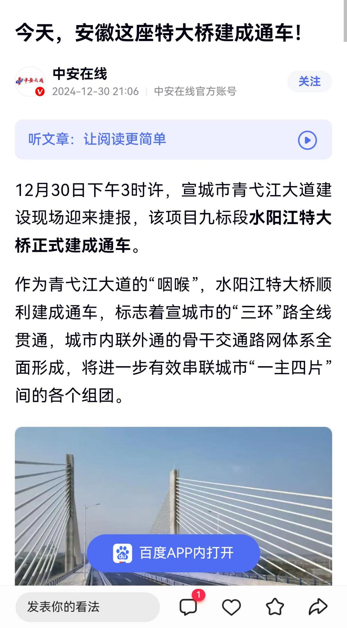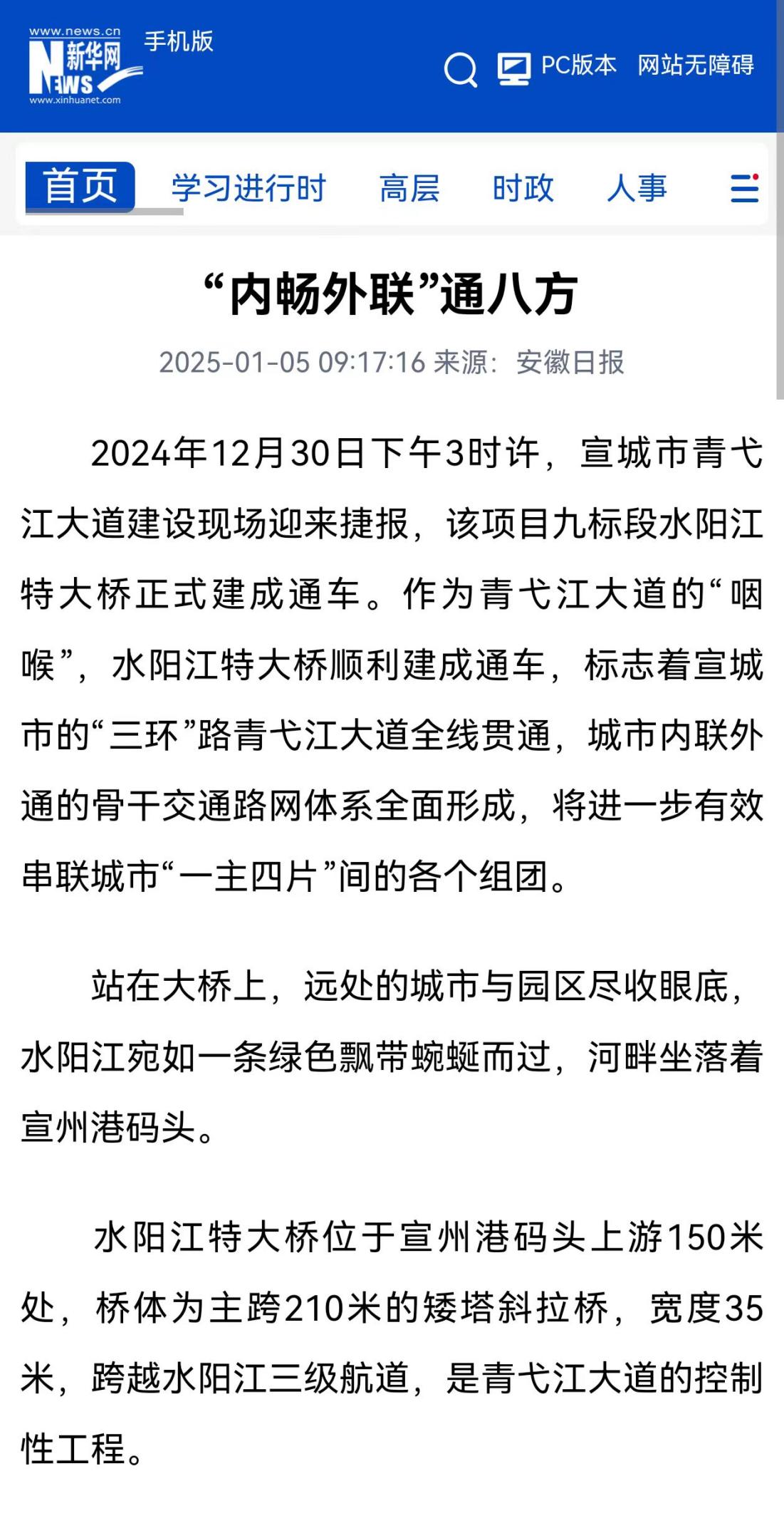 近日,建工路港承建的宣城市青弋江大道水陽江特大橋正式建成通車,受到安徽日報紙媒、新華網(wǎng)、中安在線等多個主流媒體關(guān)注報道。