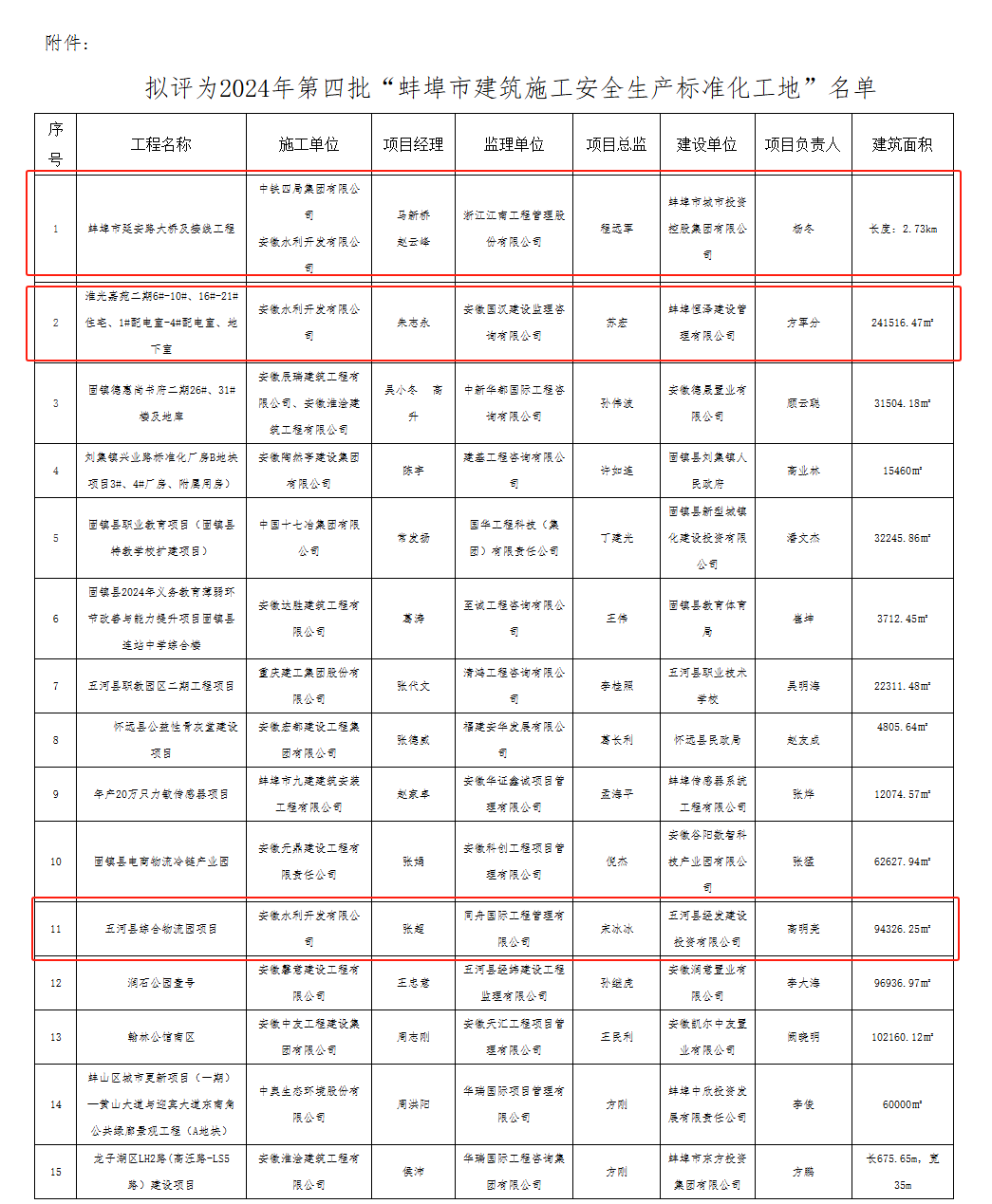 近日,建工水利承建的延安路大橋及接線工程、淮光嘉苑二期安置房項目、五河縣綜合物流園項目憑借高標準的安全管理體系與規(guī)范化施工,獲評“蚌埠市建筑施工安全生產(chǎn)標準化示范工地”榮譽稱號。