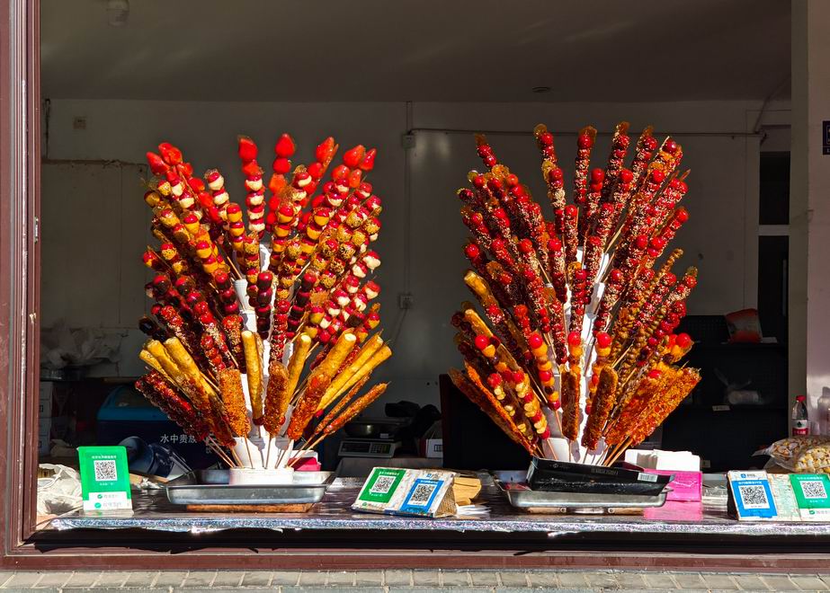 作品簡介:色彩鮮艷的冰糖葫蘆,山楂裹著晶瑩糖衣,搭配著其他食材,整齊地插在架子上。這道傳統(tǒng)美食,不僅有著酸甜的美味,更承載著無數(shù)人童年的甜蜜回憶,喚起心底那份純真的快樂。