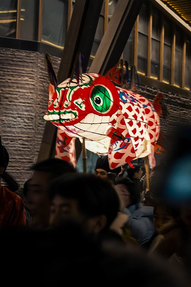 作品簡介:魚燈搖曳,流光繪春,人頭攢動,皆為新年而來。時光輕輕,步履慢慢,用竹竿支起的魚燈猶如年獸,炯炯有神的雙目驅(qū)趕舊年的不安與災(zāi)難。頂一盞花燈,許一歲安寧,愿山河無恙,煙火尋常。