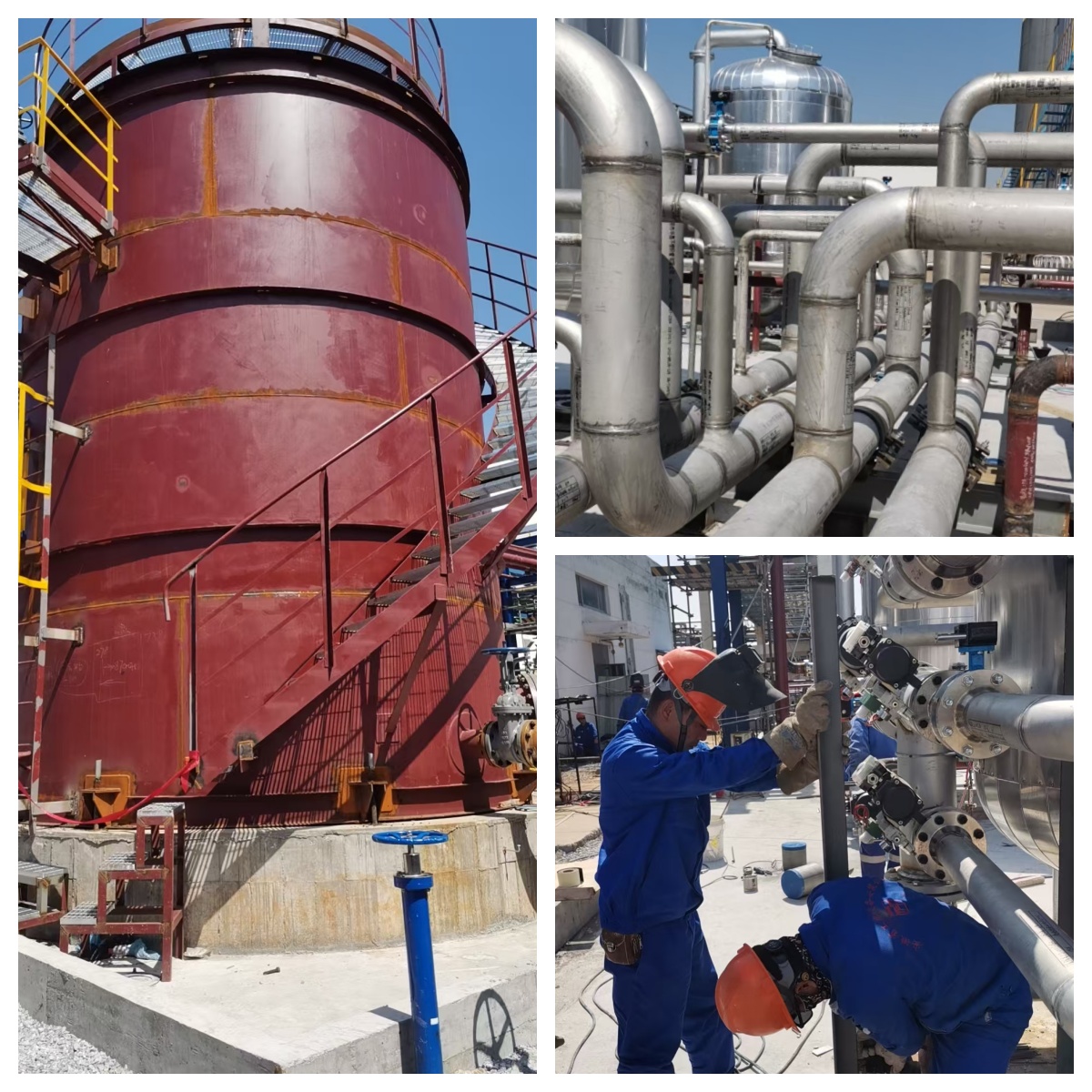 面對重重挑戰(zhàn),土建、安裝、電儀等各專業(yè)在有限的施工區(qū)域和緊張的工期內(nèi)緊密協(xié)作,加班加點(diǎn),全力確保項(xiàng)目按期交付。安裝專業(yè)任務(wù)繁重,需現(xiàn)場制作1座120立方米儲罐,安裝4臺除鐵過濾器、3臺精密過濾器、3排管廊架以及2臺提升泵。此外,還需鋪設(shè)350米各規(guī)格(DN200、DN150、DN100等)的不銹鋼工藝管道和250米碳鋼管道。土建專業(yè)主要負(fù)責(zé)廢水輸送泵、廢水收集罐、精密過濾器、除鐵反應(yīng)器設(shè)備及配套管架基礎(chǔ)的建設(shè),以及后期地坪的恢復(fù)。電儀專業(yè)則需完成20千米電纜敷設(shè),安裝2臺機(jī)柜、2臺操作臺、1套控制儀表設(shè)備和1套除鐵成套裝置儀表,同時(shí)完成2千米配管和200米槽盒的安裝調(diào)試工作。