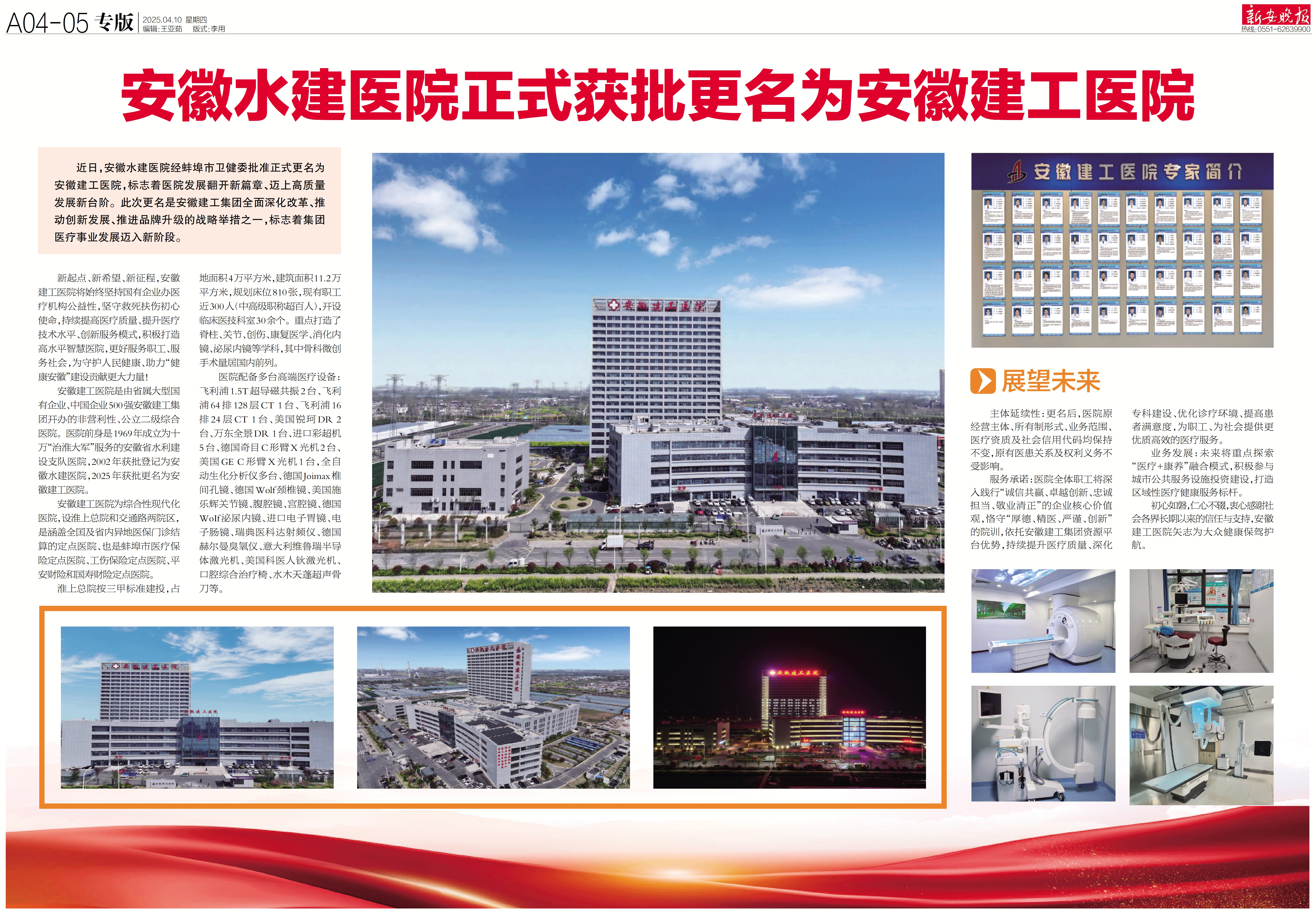 4月10日,新安晚報(bào)刊登了安徽水建醫(yī)院正式獲批更名為安徽建工醫(yī)院的報(bào)道。標(biāo)志著醫(yī)院發(fā)展翻開新篇章、邁上高質(zhì)量發(fā)展新臺階。此次更名是安徽建工集團(tuán)全面深化改革、推動創(chuàng)新發(fā)展、推進(jìn)品牌升級的戰(zhàn)略舉措之一,標(biāo)志著集團(tuán)醫(yī)療事業(yè)發(fā)展邁入新階段。