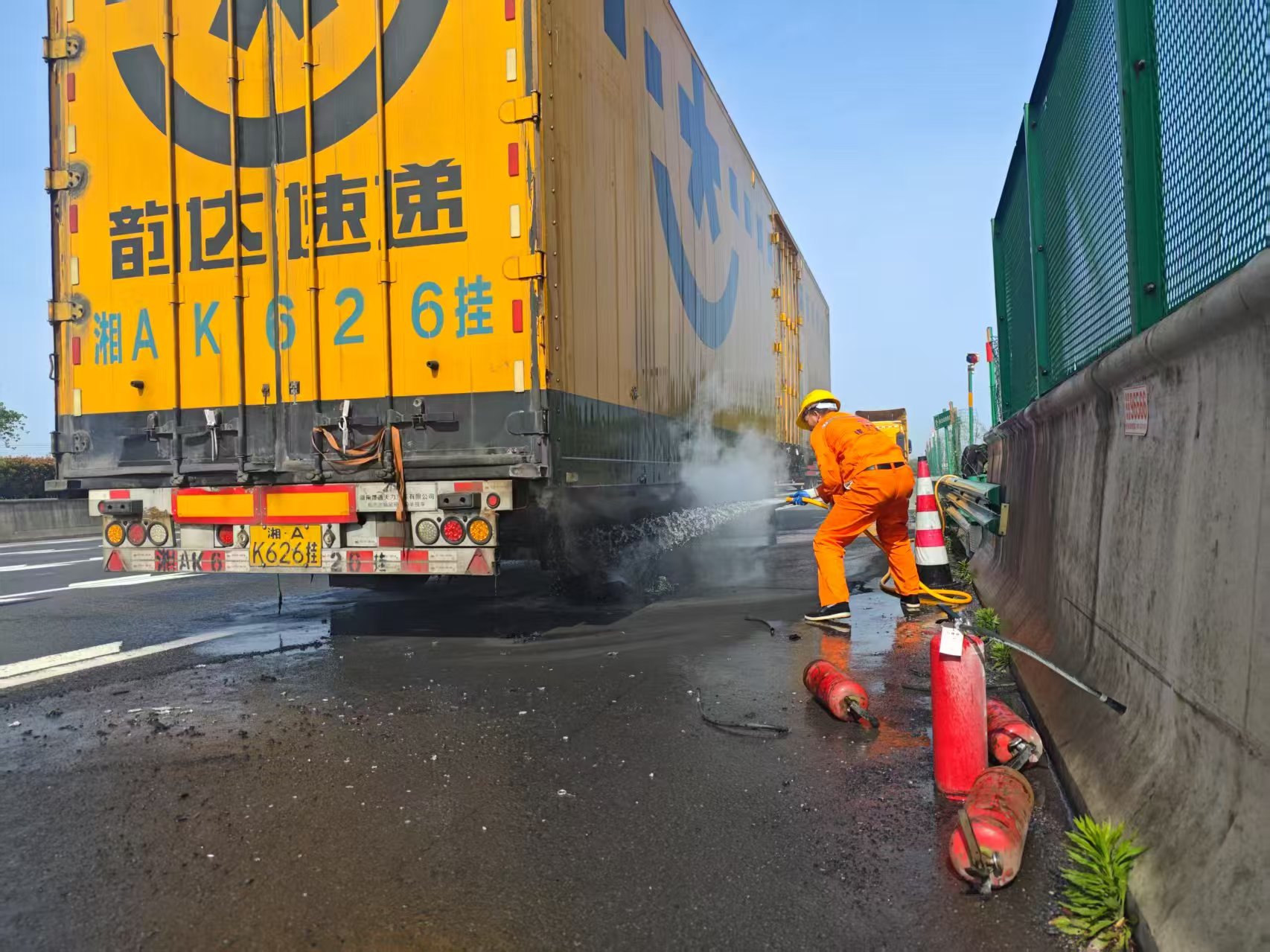 當天,施工現(xiàn)場的工作人員發(fā)現(xiàn)不遠處一輛物流車濃煙滾滾,火苗正從車廂處不斷竄出。項目負責人接報后,迅速組織現(xiàn)場施工人員攜帶滅火設備趕赴現(xiàn)場。同時,安排專人在后方設置警示標志,疏導交通,防止二次事故發(fā)生。