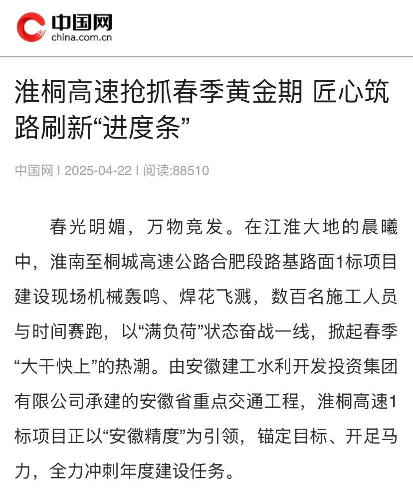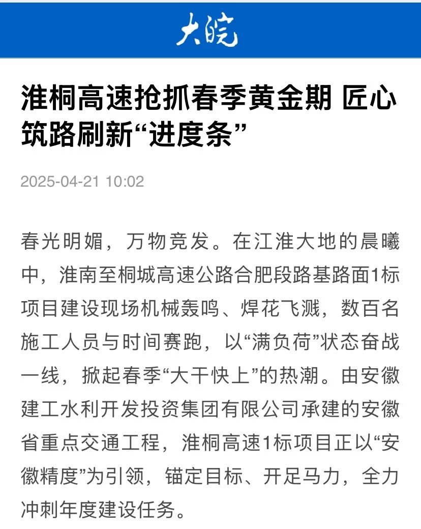 建工水利淮南至桐城高速公路合肥段路基路面1標(biāo)項目建設(shè)現(xiàn)場機(jī)械轟鳴、焊花飛濺,數(shù)百名施工人員與時間賽跑,以“滿負(fù)荷”狀態(tài)奮戰(zhàn)一線,掀起春季“大干快上”的熱潮,全力沖刺年度建設(shè)任務(wù),受到中國網(wǎng)、大皖新聞等主流媒體關(guān)注報道。