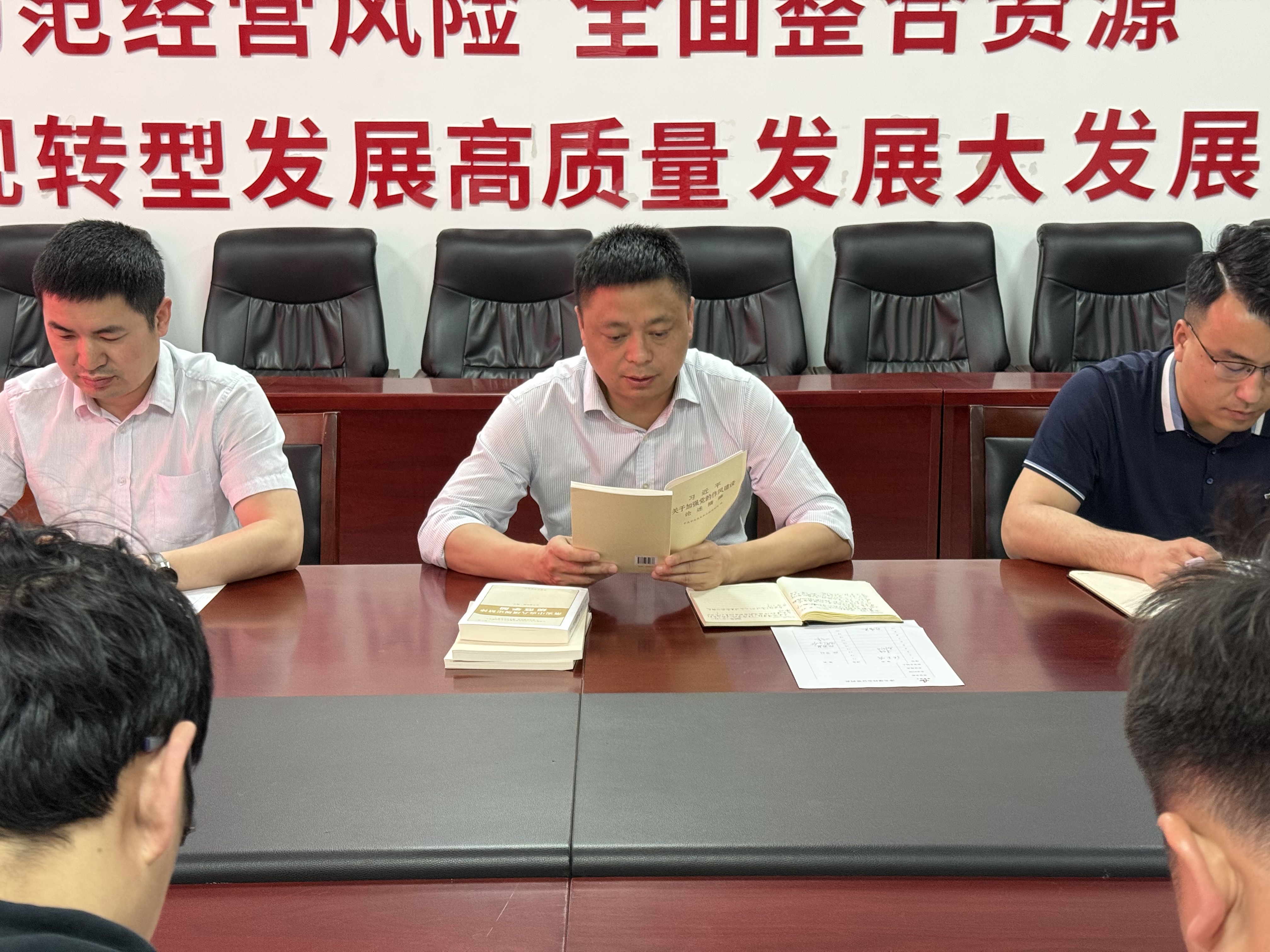 專題學(xué)習(xí)會以“領(lǐng)學(xué)+共讀”形式展開。黨委書記、董事長、總經(jīng)理張玉明領(lǐng)學(xué)《習(xí)近平關(guān)于加強(qiáng)黨的作風(fēng)建設(shè)論述摘編》第一章“黨的作風(fēng)關(guān)系人心向背,決定黨和國家事業(yè)成敗”;隨后,黨員采取輪值領(lǐng)讀方式,逐頁領(lǐng)學(xué)第二章“作風(fēng)問題本質(zhì)上是黨性問題”,現(xiàn)場學(xué)習(xí)氛圍濃厚。