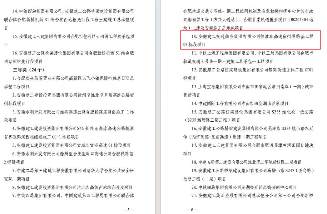 近日,安徽省住房和城鄉(xiāng)建設(shè)廳、安徽省總工會(huì)聯(lián)合發(fā)布《關(guān)于表?yè)P(yáng) 2024 年度安徽省重大項(xiàng)目建設(shè)勞動(dòng)競(jìng)賽優(yōu)秀項(xiàng)目的通報(bào)》,公司潭沖河家園 D、E 地塊 EPC 總承包項(xiàng)目和徐淮阜高速宿州段路基工程 02 標(biāo)項(xiàng)目表現(xiàn)突出,成功入選優(yōu)秀項(xiàng)目名單。