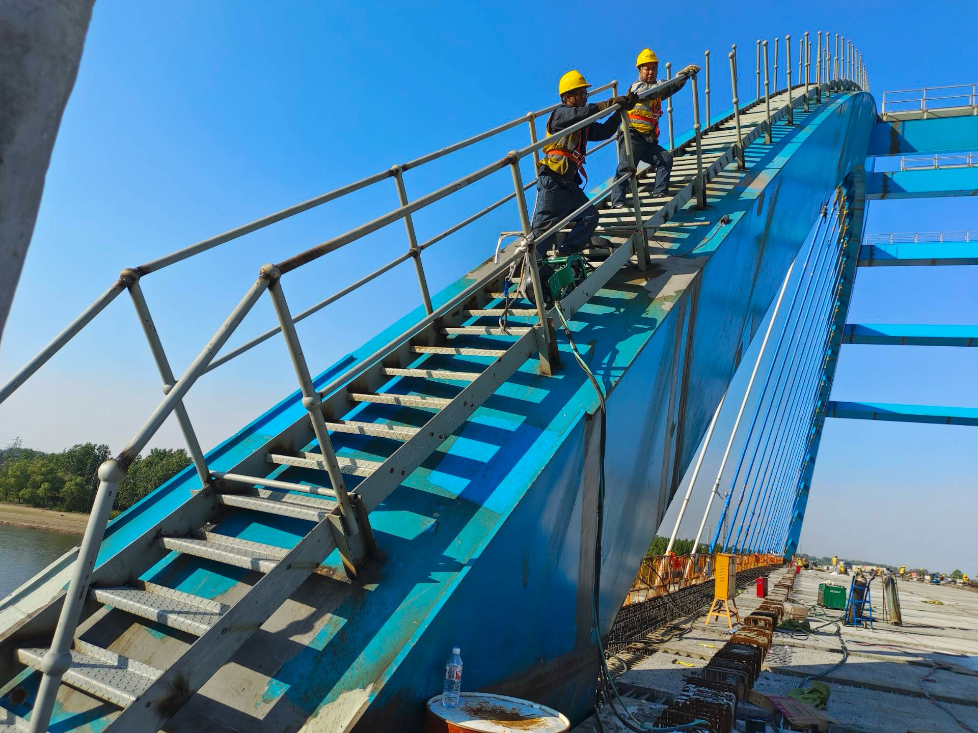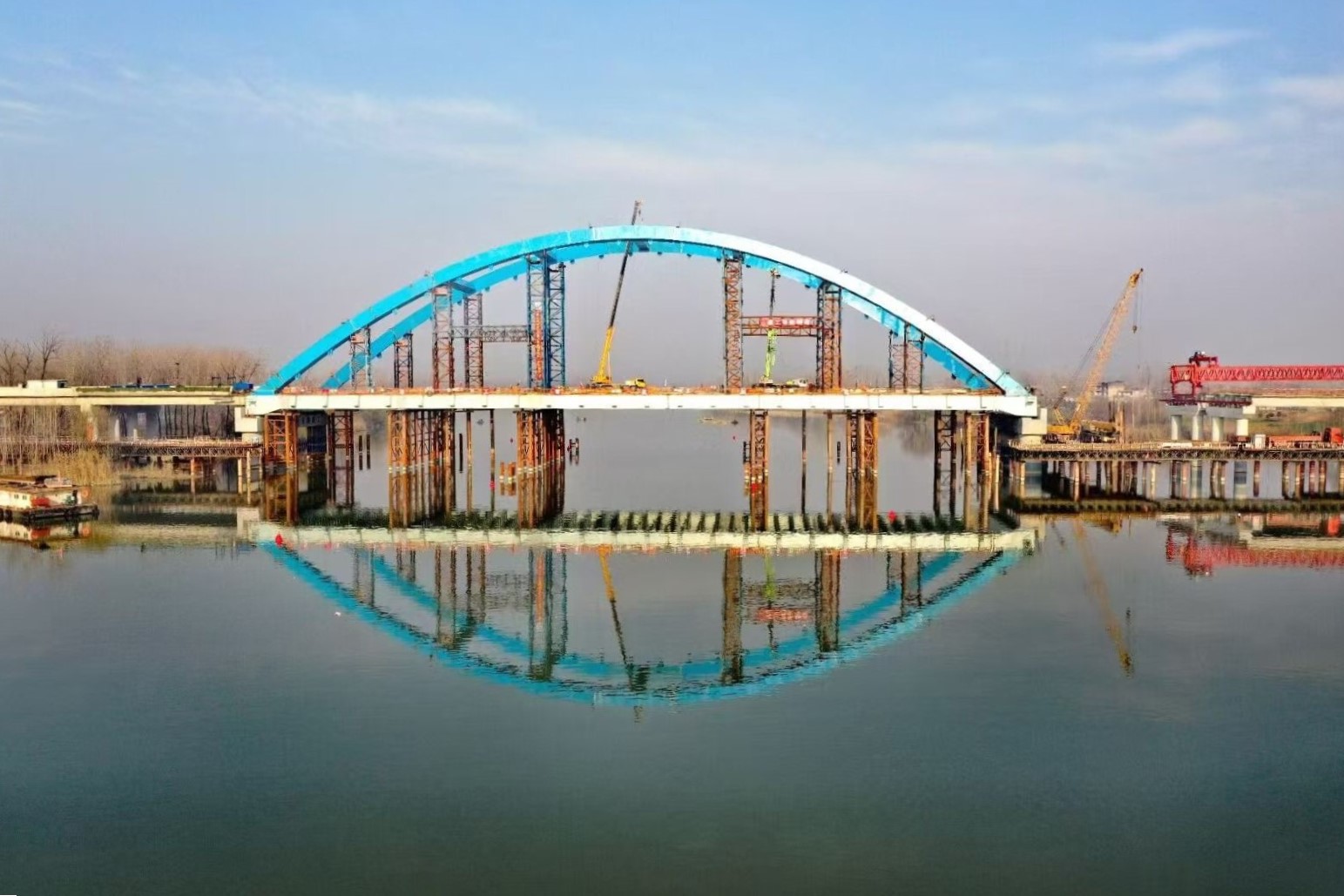 截至目前,大橋主體結(jié)構(gòu)、橋面鋪裝、主跨主梁安裝、主跨拱橋預(yù)制橋面板安裝任務(wù)已全部完成,正在緊張有序地進(jìn)行主橋現(xiàn)澆濕接縫作業(yè)。在開(kāi)展橋面鋪裝和主跨拱橋安裝施工過(guò)程中,項(xiàng)目團(tuán)隊(duì)運(yùn)用高精度的測(cè)量?jī)x器、先進(jìn)的吊裝設(shè)備,精準(zhǔn)控制、精確安裝,確保各項(xiàng)工作達(dá)標(biāo)、安全、高效。
