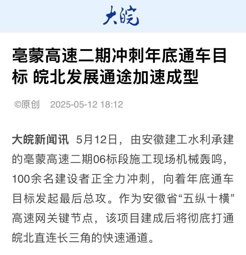 5月12日,建工水利亳蒙高速二期06標(biāo)施工現(xiàn)場(chǎng)機(jī)械轟鳴,100余名建設(shè)者正夜以繼日、全力沖刺,向著年底全線通車(chē)目標(biāo)發(fā)起最后總攻。作為安徽省“五縱十橫”高速網(wǎng)關(guān)鍵節(jié)點(diǎn),項(xiàng)目建成后將徹底打通皖北直連長(zhǎng)三角的快速通道。此前,該項(xiàng)目建設(shè)期間,多次受到安徽日?qǐng)?bào)、大皖新聞、中安在線等主流媒體關(guān)注報(bào)道。