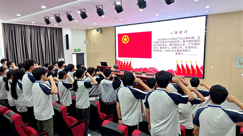 儀式在莊嚴(yán)的國(guó)歌聲中拉開(kāi)帷幕。全體師生肅立,齊唱國(guó)歌,表達(dá)了對(duì)祖國(guó)的熱愛(ài)與崇敬之情。隨后,陳淼老師宣讀了新團(tuán)員名單,新團(tuán)員上臺(tái)領(lǐng)取團(tuán)員證和團(tuán)徽,全體新團(tuán)員在團(tuán)委委員程蓉的帶領(lǐng)下,面向團(tuán)旗莊嚴(yán)宣誓,鏗鏘誓言響徹禮堂,彰顯著新時(shí)代青年的蓬勃朝氣。新團(tuán)員代表在發(fā)言中表達(dá)了對(duì)團(tuán)組織的向往和加入共青團(tuán)的自豪之情,表示將以更高的標(biāo)準(zhǔn)要求自己,努力學(xué)習(xí)科學(xué)文化知識(shí),積極參與團(tuán)組織的各項(xiàng)活動(dòng),為共青團(tuán)事業(yè)貢獻(xiàn)自己的力量。