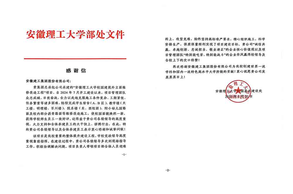 近日,安徽理工大學給安徽建工集團發(fā)來感謝信。信中對建工總承包公司精心組織施工、科學安排生產(chǎn)、高標準高質(zhì)量完成安徽理工大學校園建筑外立面維修改造工程項目給予好評,對安徽建工集團助力其創(chuàng)建世界一流學科和國內(nèi)一流特色高水平大學表示感謝。